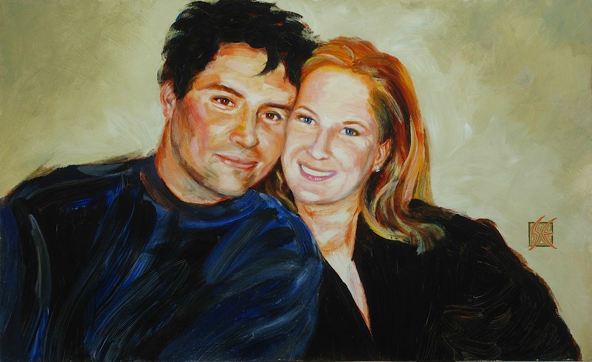I worked on this anniversary portrait at the show, getting it about 90% done by Sunday. It was fun to be able to ask passersby and other OSA members for critique and recommendations. It’s for an Etsy commission; I sent my customer a digital image of it for approval last week and he said, “You are a genius! I love it! It is amazing! I am so grateful to you. I will pay for it tonight. No changes necessary. Thank you!!!!!” Music to my ears…very encouraging. I hope his wife likes it as well as he does, or better. It’s acrylic on a 16 x 26 hardwood panel, from customer supplied old snapshot: